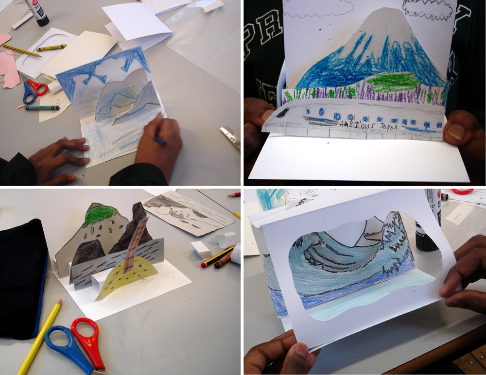 And here’s some pictures from a recent year 6 workshop at Stroud Green school, Haringey. The children were studying mountains so I set them the task of using images of famous examples to creat pop-up 3D dioramas. They were shown how to break up the images into separate layers to make foregound, middle distance and backround which we then joined together using collapsible spacers. We finished off by creating a viewing framework. I was so impressed by what they were able to do in such a short space of time.