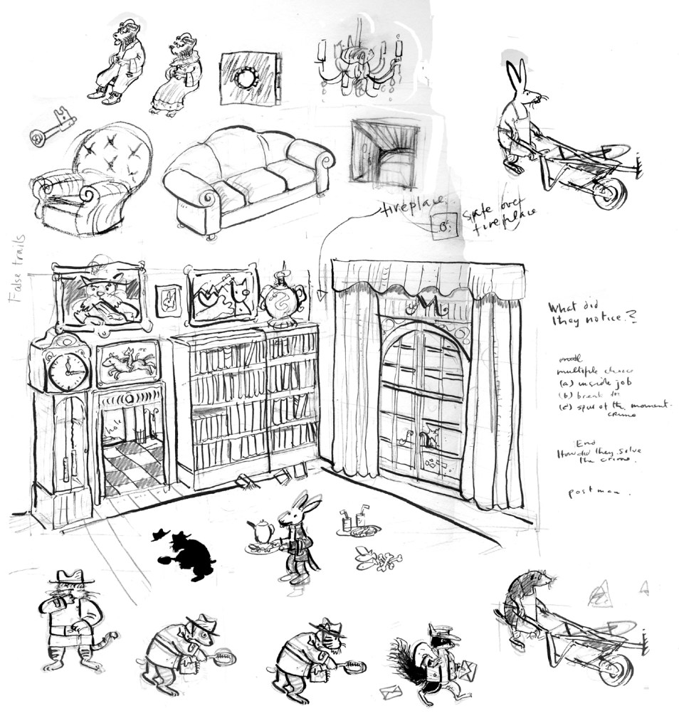 Never mind, here’s some preliminary scetches from the living room spread for your enjoyment. JOHN