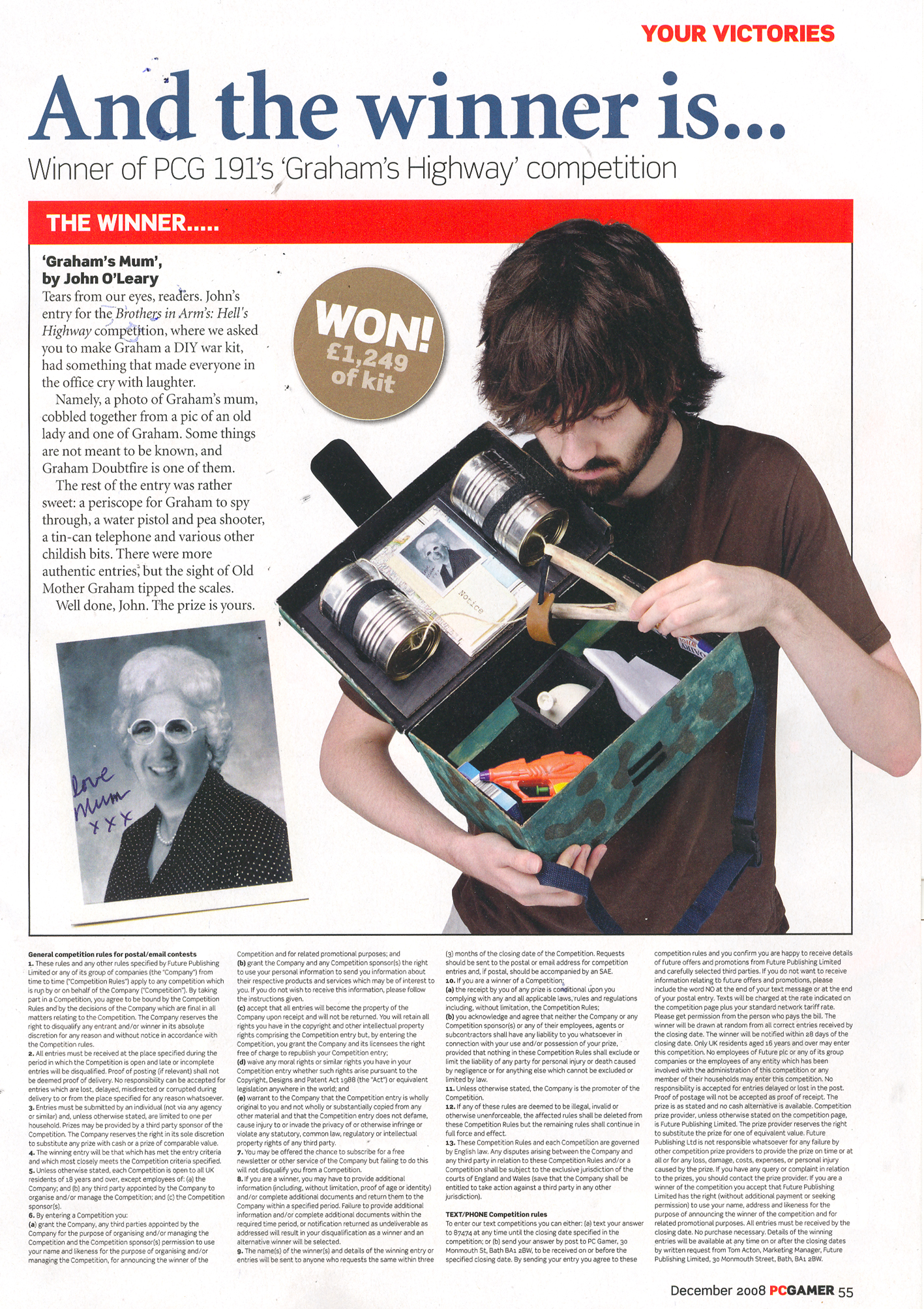As an afterthought, I decided to include a photo of Grahams girlfriend in the box. This soon became a picture of his mum brought to life by combining Grahams photo, from the PC Gamer site, with a random photo of a granny from the web, using the magic of photoshop.