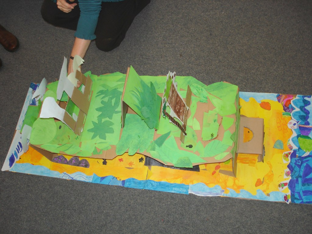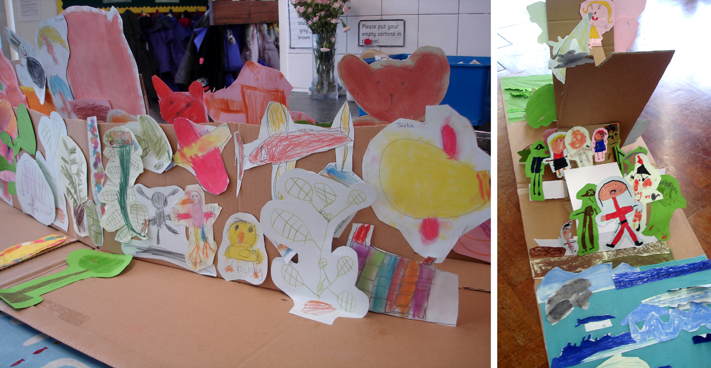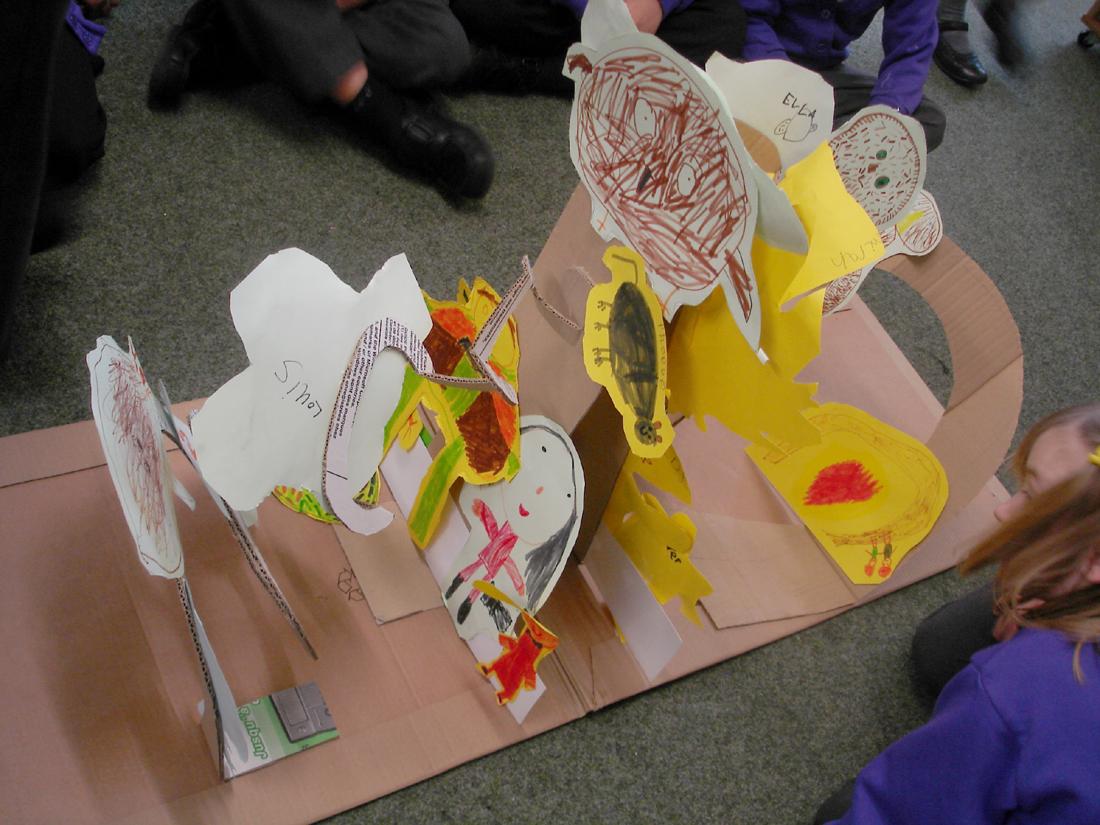 I spent two days last week in Cunningham Hill Infants School in St Albans where I worked with 5 classes of Y1s and Y2s as a visiting paper engineer. I brought along collapsible cardboard frameworks for the children to use to create giant pop-up structures.