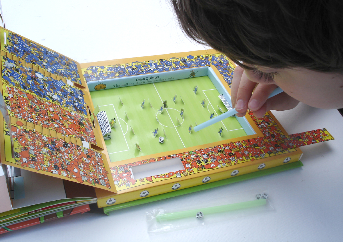 This version has a blow football game at the end, in place of the static electricity game of the original. I loved the magic of the static electricity device and the novelty aspect was enough for me, although some of the buyers and bookshops were confused about how the ‘game’ worked. Having said that, I’m also very happy with the blow football game as an alternative ending and it was also a good excuse for me to add a secret hidden container for the balls and straws.