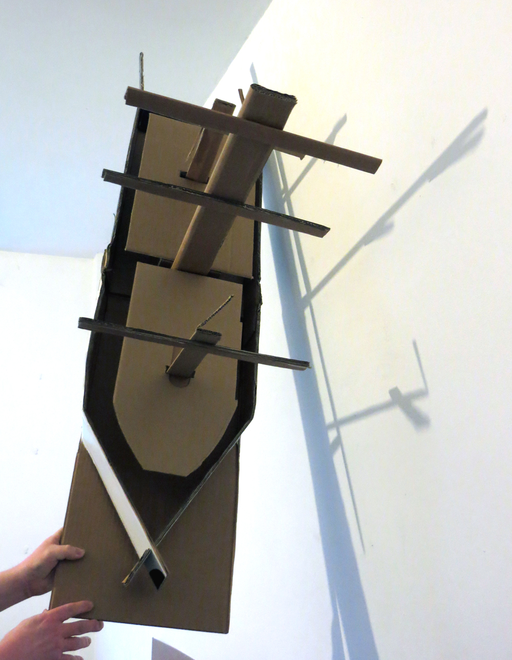 Usually when I do this exercise I’ll present the children with a framework consisting of abstract shapes and challenge them to make something out of it. With this school I’ve been given the theme of pirates so I’m creating frameworks that are clearly the beginnings of three ships. It’s relatively easy to create pop-up boats but more difficult to make them fill up the whole space, hence the fold up bits. I’m very interesting to see what the children do with these – check back later to see how they get on.