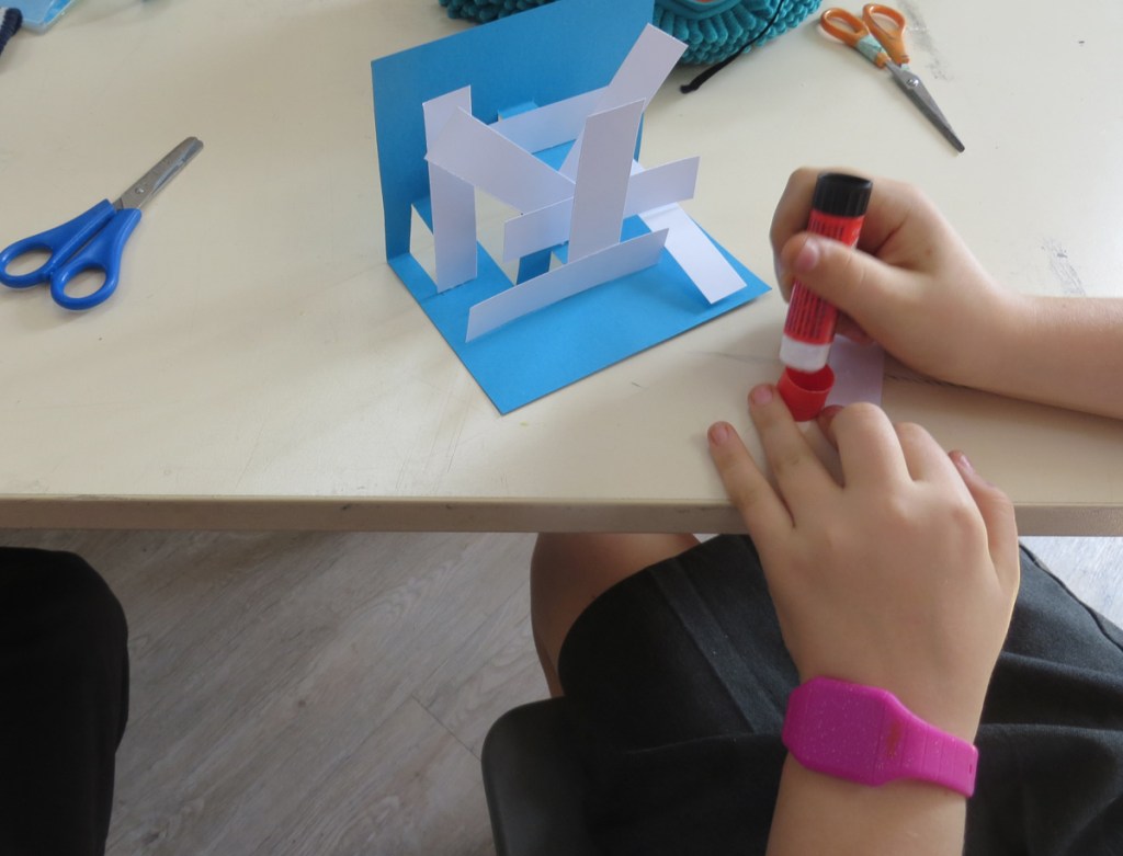 Picture shows the demo I did for Y5 and Y6. After the children make a pop-up mechanism, I usually demonstrate how to translate that into a 3D illustration and how to assemble the finished book. By the end of each session, the children have enough information to complete their books. I look forward to seeing pictures of some of the finished work.