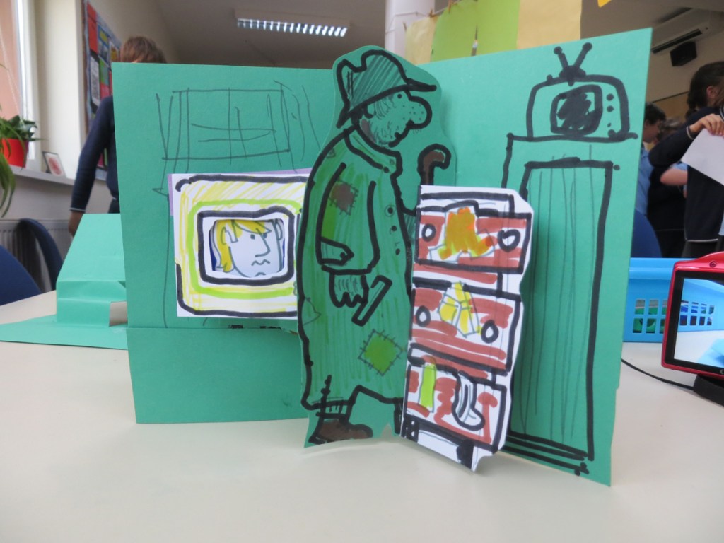 A pattern for the sessions emerged fairly early on when I matched each class to a mechanism, guiding them through the process so they all had a completed pop-up framework ready to go. Following a discussion about their storyboard ideas – the blank storyboards were sent ahead of my arrival – I used some of their material to demonstrate how to convert mechanism into fully illustrated 3D scene. Some of the images show these, others show the children’s work-in-progress.