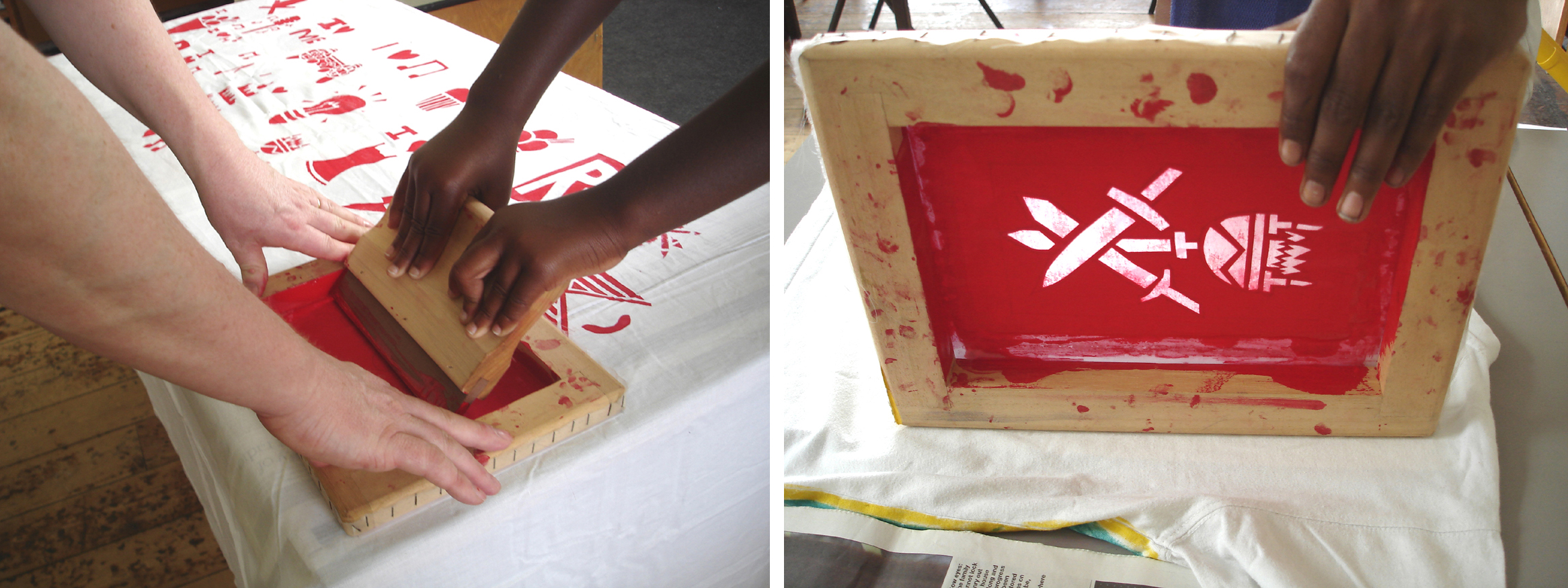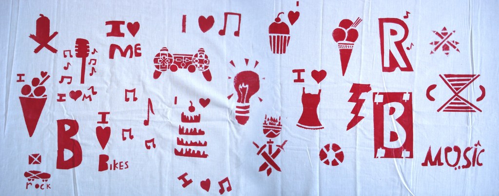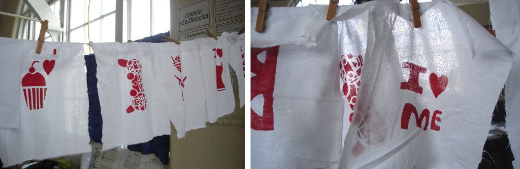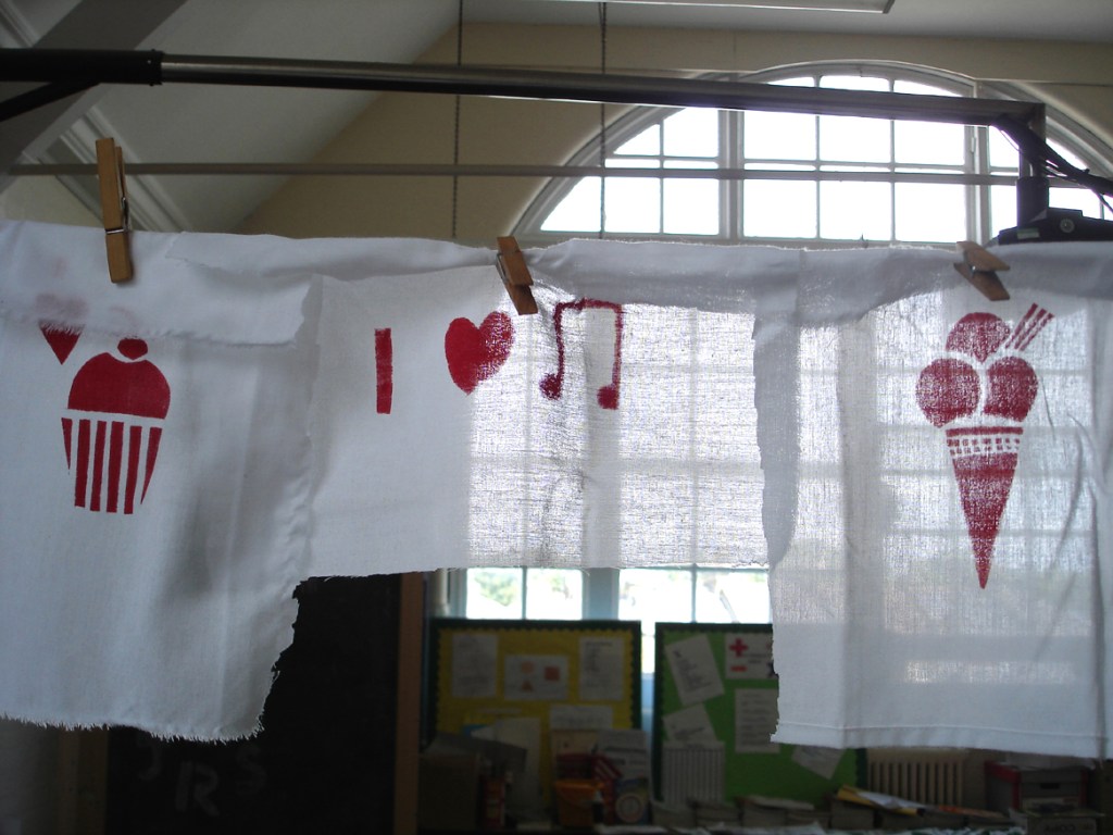 It was back to school last friday when I worked with the year 5’s at Stroud Green Primary School on a stencil and screen printing project. As you can see from the photos, the kids learnt a new skill and did some brilliant work. As well as creating the banner and printing on individual pieces of material, some also choose to print on t-shirts.