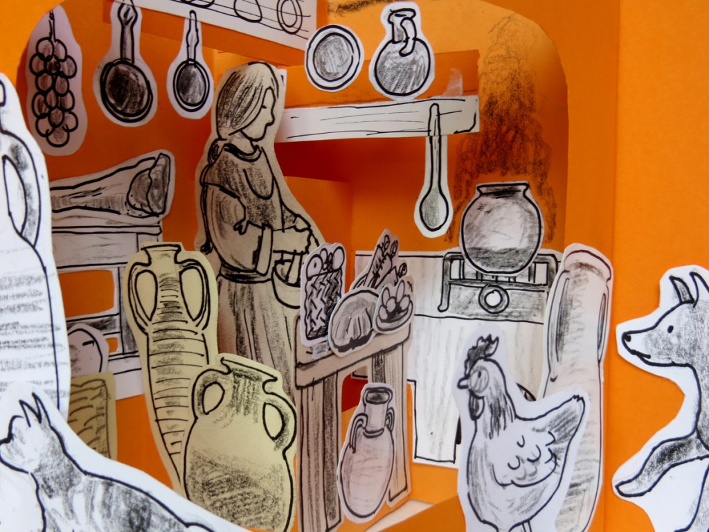 Both workshops are based around the theme of the Roman kitchen, allowing plenty of scope for food, implements, vessels, tools, pets and other rooms in the background. Workshop 1 will consist of making simple individual pop-up frameworks and adding the various elements to build up a 3D picture.