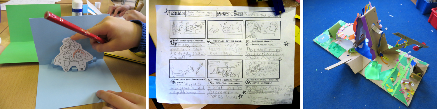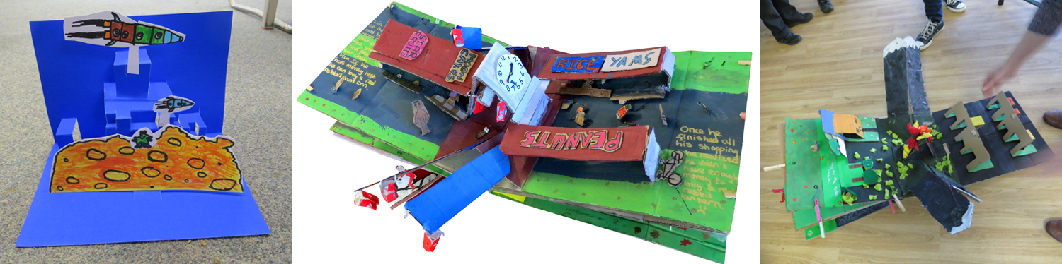A pattern for the sessions emerged fairly early on when I matched each class to a mechanism, guiding them through the process so they all had a completed pop-up framework ready to go. Following a discussion about their storyboard ideas – the blank storyboards were sent ahead of my arrival – I used some of their material to demonstrate how to convert mechanism into fully illustrated 3D scene. Some of the images show these, others show the children’s work-in-progress.